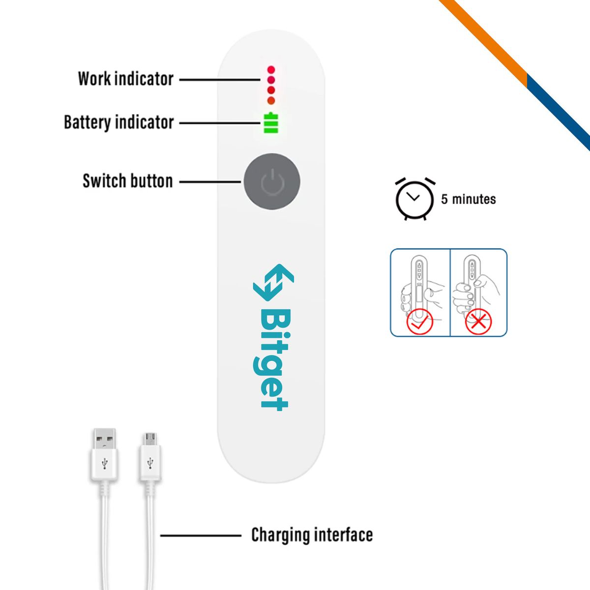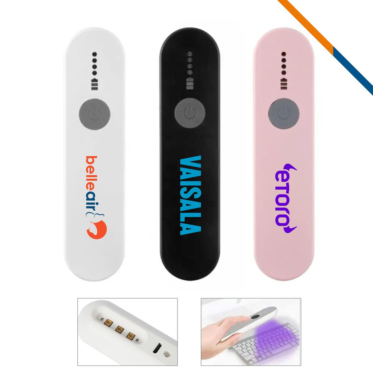 Smart UVC sterilizer makes your life easier with a simple press and scan. It is made of ABS Plastic, LED, and a built-in 400 mAh battery. Applying directly to a surface for 10-30 seconds can clean and eliminate up to 99.9% of germs, viruses and bacteria. It has a safety protection circuit; UV light will automatically turn off when it is turned upside down to protect the human body from direct ultraviolet radiation. The maximum working time is 5 minutes, and it will automatically power off after that. Enjoy a healthier life with fewer germs around. It is easy to use, lightweight and portable with a built-in battery. Large imprint size available with spot color & full color imprint.